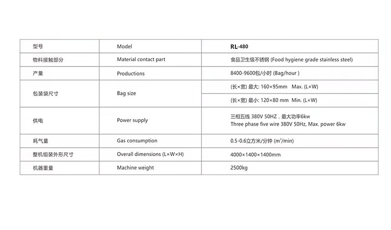 (1)RL-480四出給袋式全自動包裝機主要由兩部分組成:四出給袋式包裝機系統(tǒng)、灌裝系統(tǒng)。